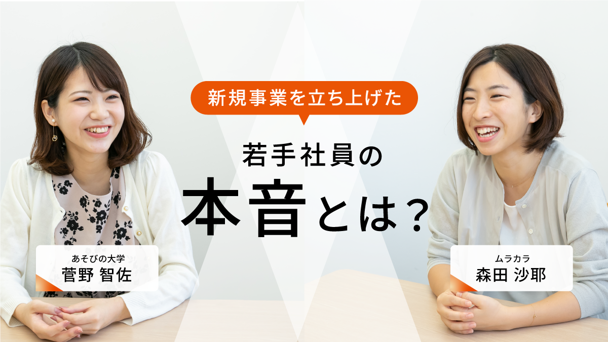 リヴァは、新規事業の立ち上げを担えるリーダー候補となる人材を求め、新卒採用活動を行っています。そこで、実際に新卒で入社して新規事業を立ち上げた森田沙耶(写真右/「ムラカラ」リーダー)と菅野智佐(同左/「あそびの大学」リーダー)に「リヴァにおける新規事業立ち上げ・推進の特徴」と「事業を発展させる上で大切にしていること」について聞きました。