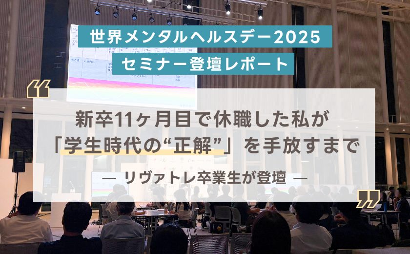 今年は「若者のメンタルヘルス ~環境変化とメンタルヘルスの関係~」をテーマに、2025年10月8日(水)第5回世界メンタルヘルスデーセミナーが開催され、弊社の社会復帰支援サービス「リヴァトレ」の卒業生である、しましまさん(仮名)が登壇しました。