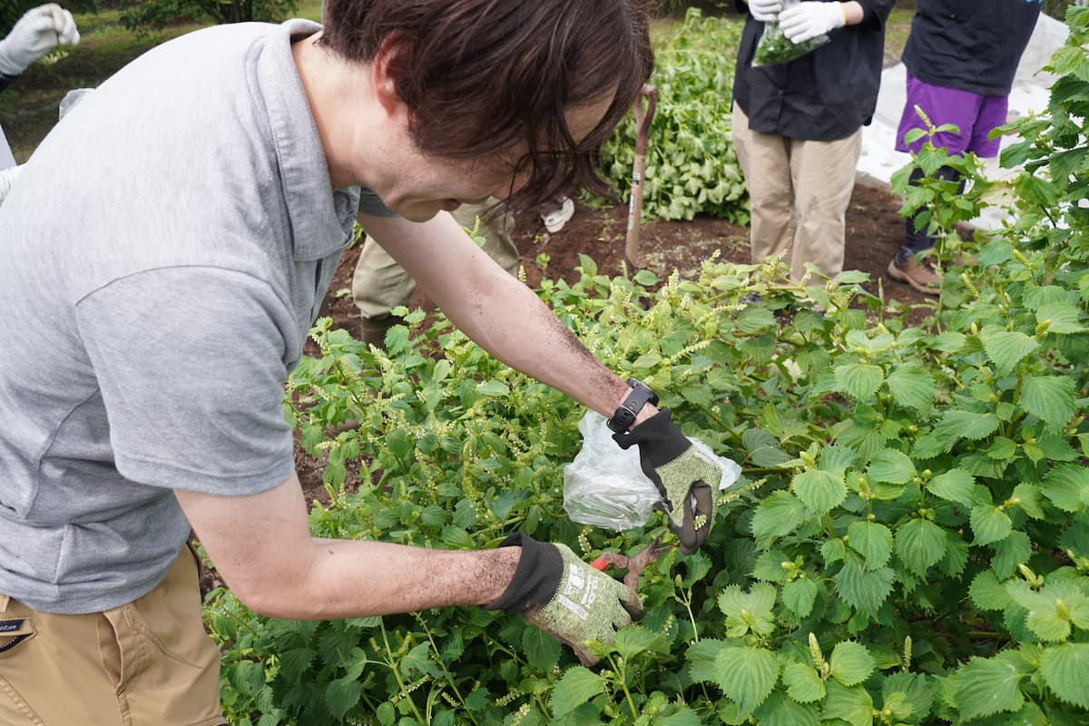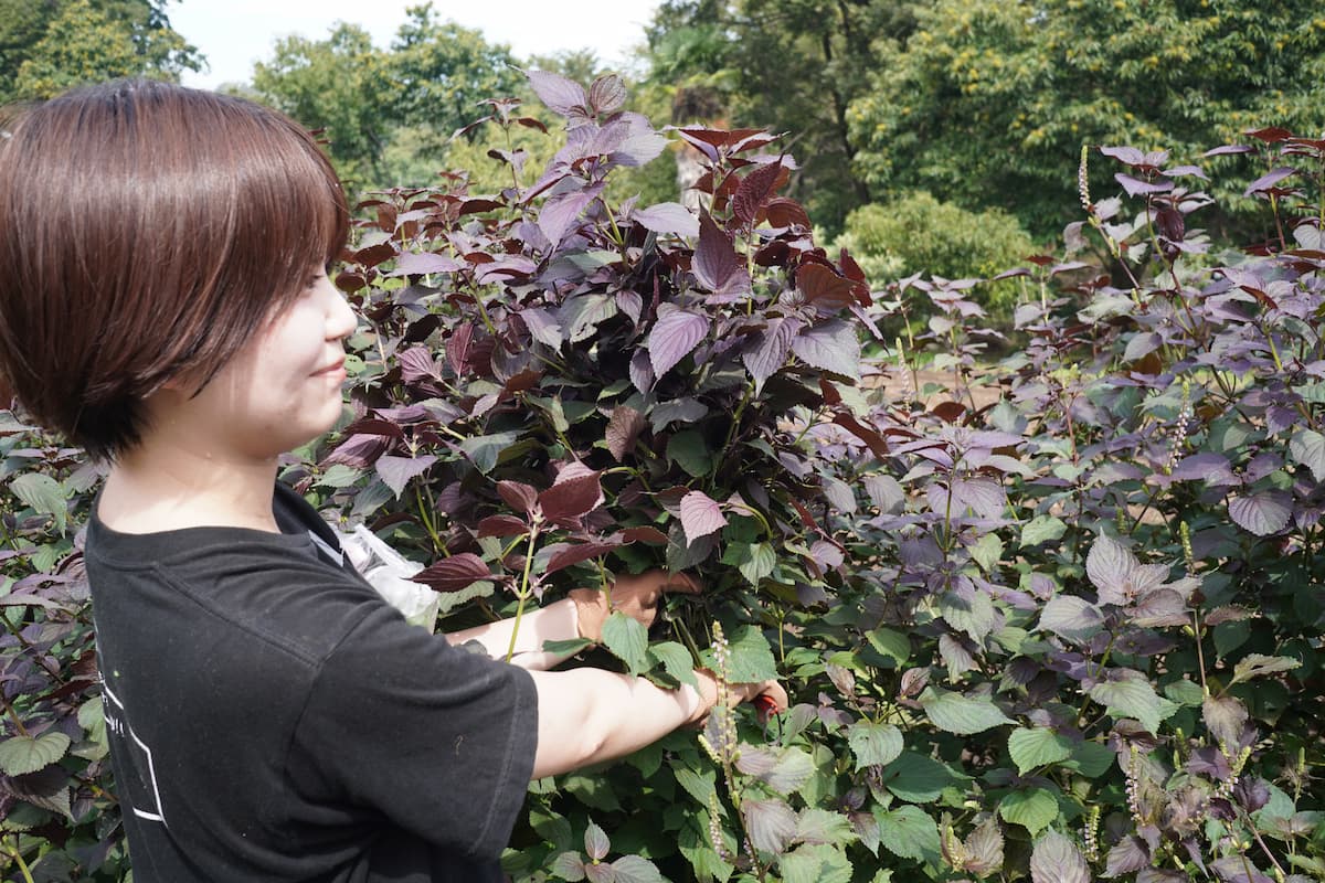 「今日はこの赤紫蘇の季節なので、みんなで収穫しましょう」。そう言う石坂さんの後に続いて、私たちは畑へ向かいました。