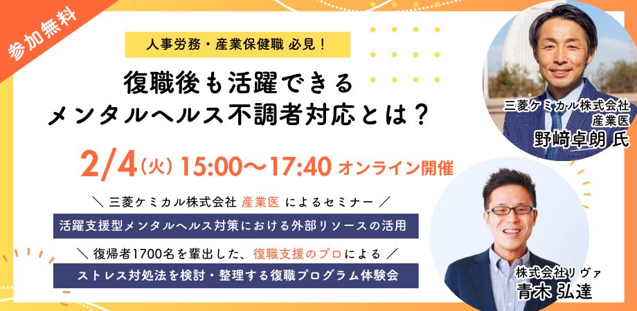 この度株式会社リヴァ主催で、産業保健職・人事労務の方向けにオンラインイベントを開催いたします。