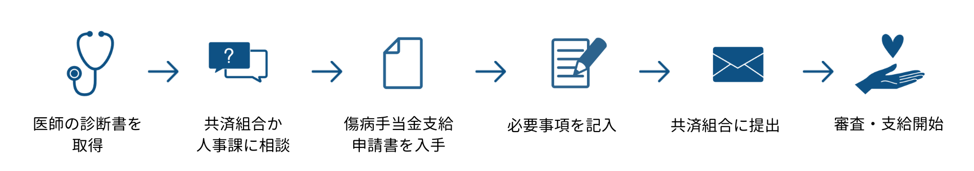 所属する共済組合から、所定の「傷病手当金支給申請書」を入手します。