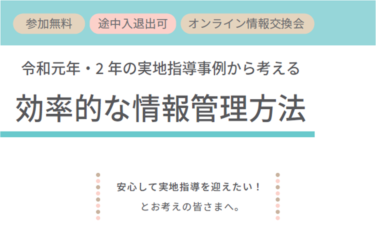 当日は、弊社からも複数回の実地指導を経験したスタッフが参加をし、下記テーマ等について皆様とお話をさせていただく予定です。