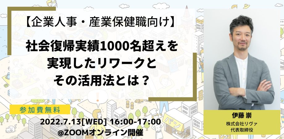 株式会社リヴァでは、2022年7月13日(水)16時より、代表取締役 伊藤崇によるオンラインセミナー「社会復帰実績1000名超えを実現したリワークとその活用法とは?」を開催いたします。